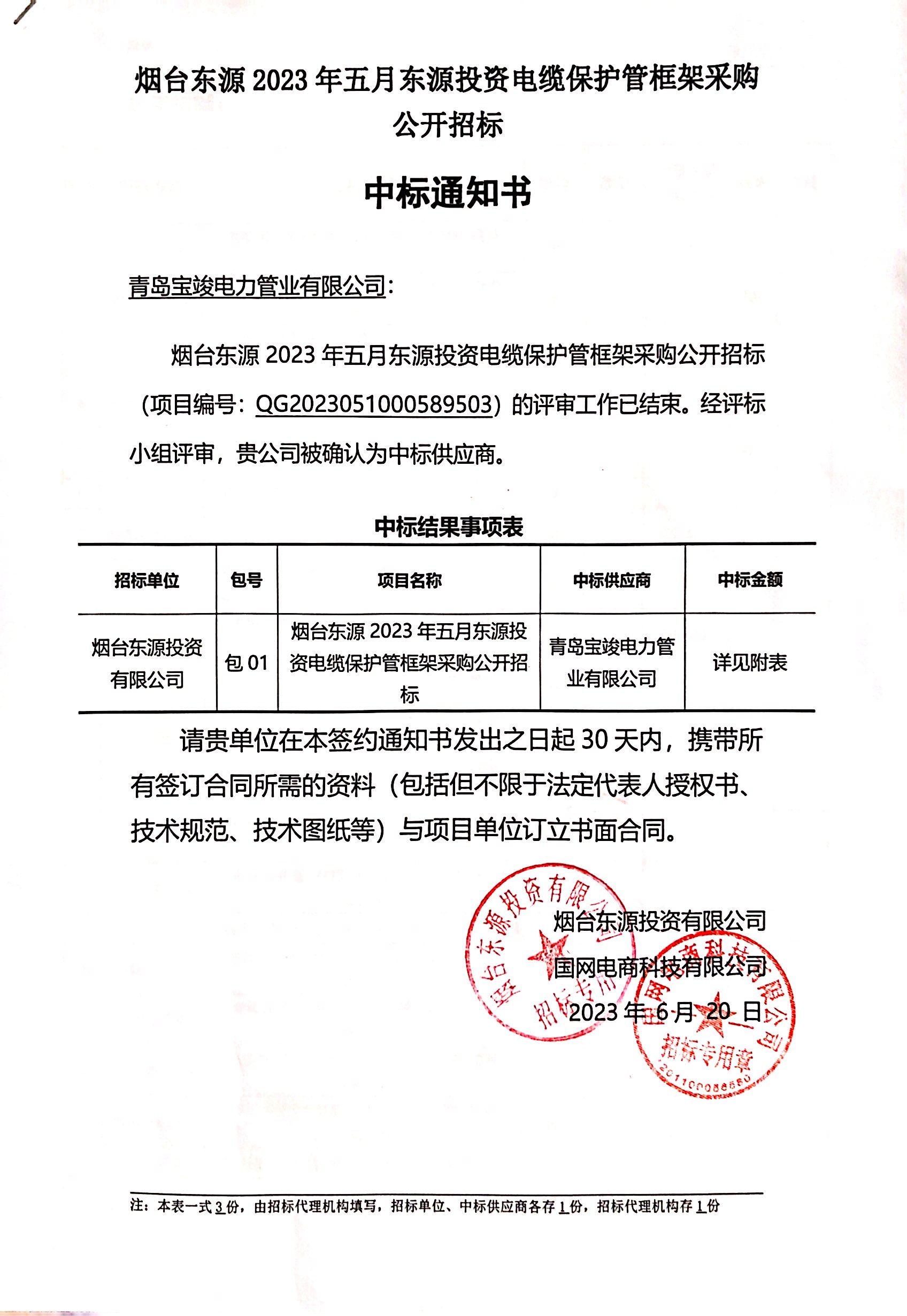 煙臺東源2023年五月東源投資電纜保護管框架采購公開招標